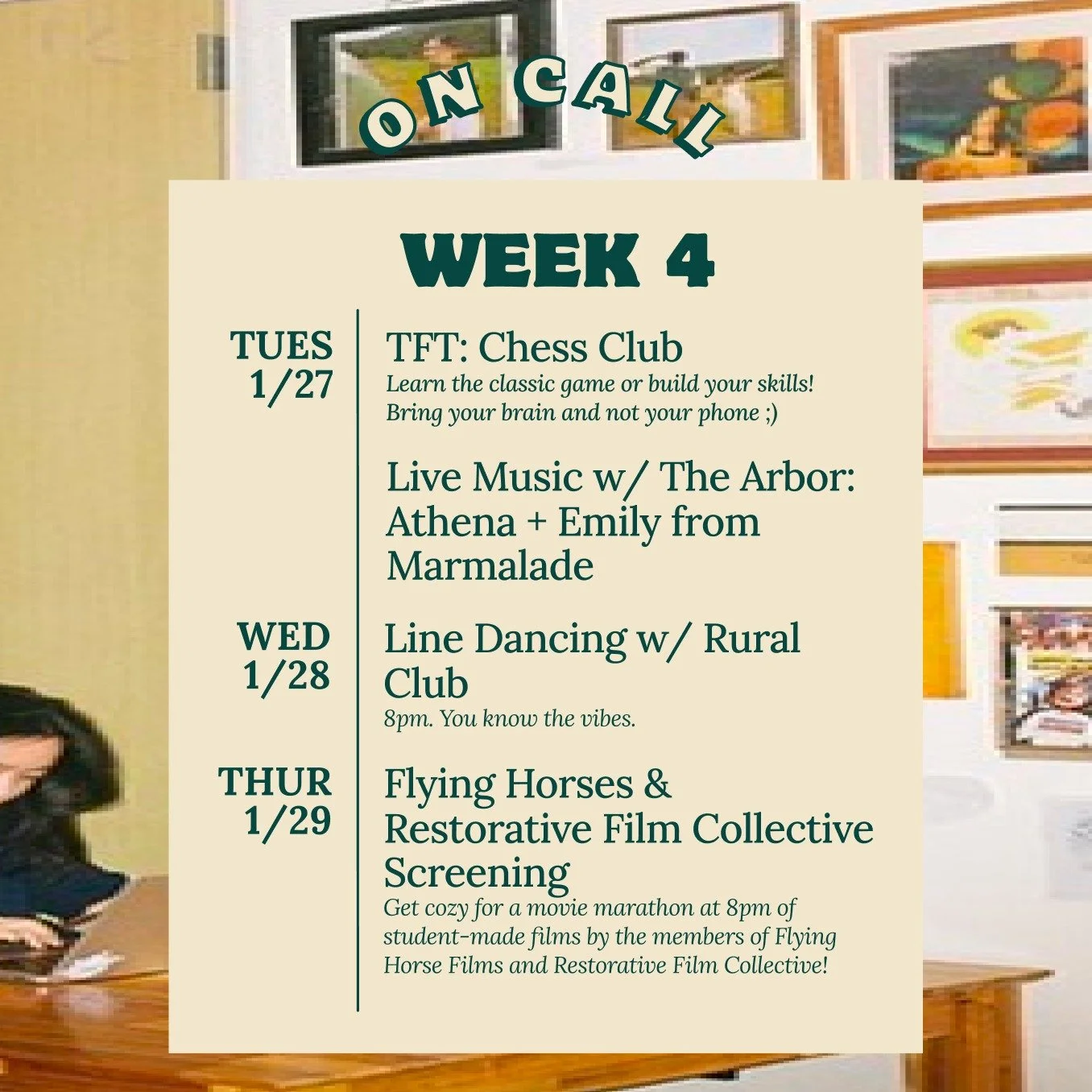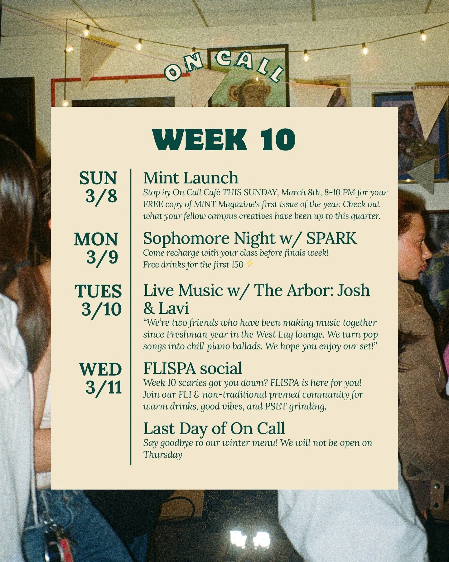 On Call Café is a student-run, late-night café. We’re on a mission to build community, increase belonging, and serve the best vibes on campus.