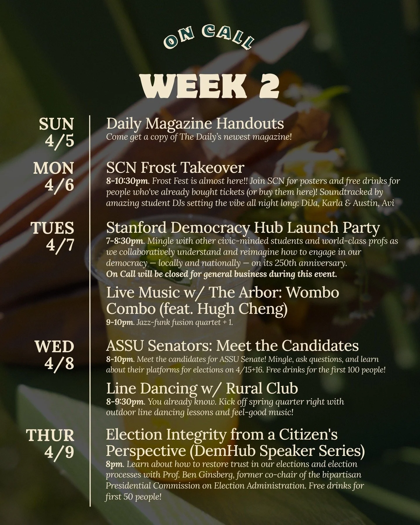 On Call CafΓ© is a student-run, late-night cafΓ©. Weβre on a mission to build community, increase belonging, and serve the best vibes on campus.