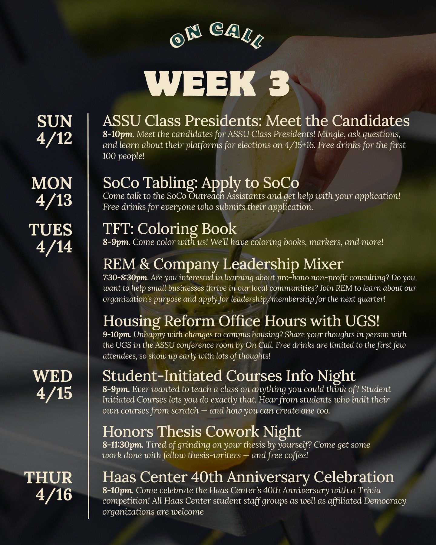 On Call CafΓ© is a student-run, late-night cafΓ©. Weβre on a mission to build community, increase belonging, and serve the best vibes on campus.